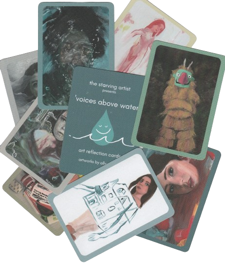 Some themes include voices above water for climate-wellbeing, the migrant voice for exploration of effects and impacts of migration labour, the vulnerable man for exploring men’s mental health and the starving artist cards for eating disorders and body image reflection.